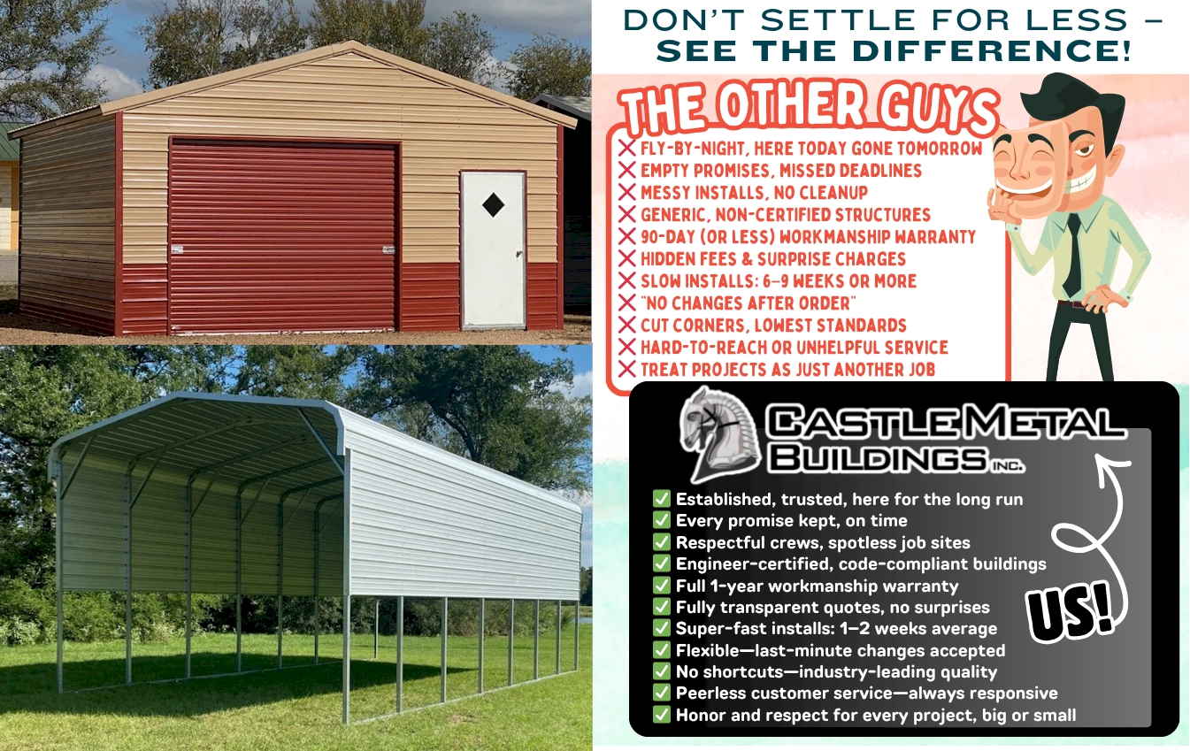 We’re proud to partner with Castle Metal Buildings, offering engineer-certified steel structures designed to meet Texas codes while giving you the strength, durability, and value you deserve. From carports to commercial shops, Castle delivers quality you can trust.